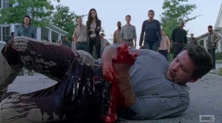 For those who are unfamiliar with the comics, Spencer brown-noses his way into a meeting with Negan and attempts to persuade Negan to kill Rick. Negan responds to the odd request by gutting Spencer right there in front of everyone.