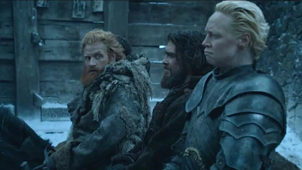 As for Brienne — well, after a season of lighting candles in windows and rowing into the distance, she looks to be in an equally snowy backdrop. With an approaching army of abominable snowmen, could it be Brienne's time that is running out? Knowing that both characters are favorites among fans of the show, that is a dangerous position for anyone to be in. While it seems splitsville is destined for the girl from Tarth and the bushy blaggard, I guess we will have to go back to shipping Brienne and Jaime won't we?