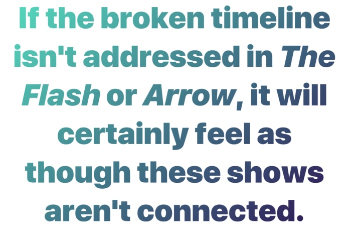 Still, if the broken timeline isn't addressed in The Flash or Arrow, it will certainly feel as though these shows aren't connected. Yet, when the crossovers happen, we are supposed to believe they are. What happens to one Earth should happen to all, and I'm going to be surprised, and more than a little disappointed, if the broken timeline isn't at least addressed in the other Arrowverse shows.