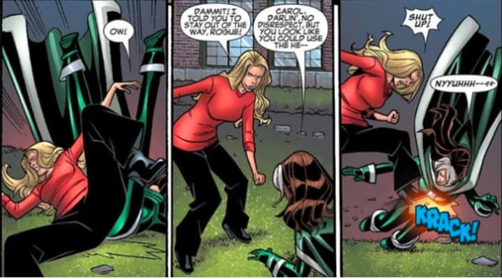 Yeah, right. Rogue thought it was an ambush, and her attempt to fight back included an attempt to drain Carol's powers. Ms. Marvel was understandably furious that Rogue would ever do that again! The fight came to an end when Rogue combined those stolen powers with abilities she'd already absorbed from Iceman.