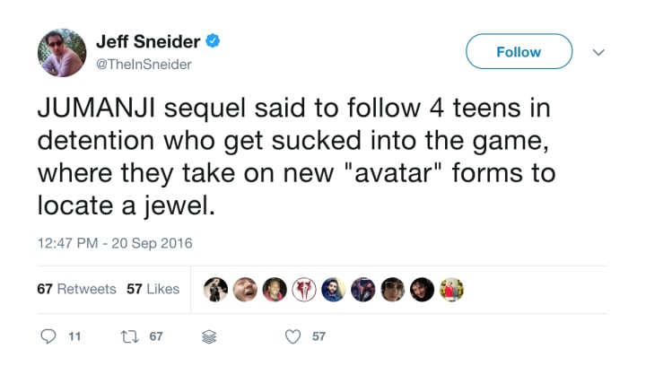 ..I'll reunite with ol' friends Kevin Hart * Jack Black and we have the honor to introduce a whole new generation to the amazing world of #JUMANJI. *(for the record we are NOT making a reboot, but rather a continuation of the awesome JUMANJI story).