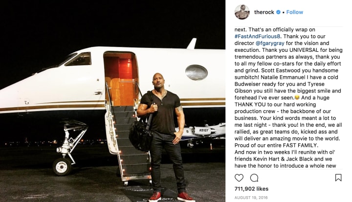 In Johnson's Instagram post, he says a few parting words towards his castmates on the set of Fast and Furious 8, which he followed up by briefly mentioning his next project, Jumanji .