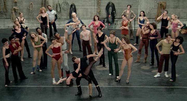 The fact that this is obviously what Fosse wants us to understand makes it no less an unnerving experience, a dance is intersected with shots of an actual open-heart surgery operation — a scene that still shocks even in an era of graphic medical dramas — or as a laughing, drinking group of people jump to a lonely Fosse roaming an empty white hospital corridor reminiscent of Kafka; in despair over his illness, as he bangs his head against the wall until the blood leaves a red line.