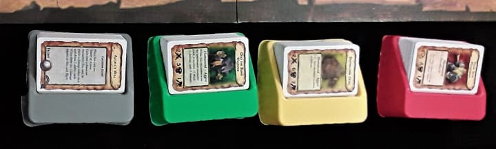 Challenge cards are drawn from the bottom of the deck and have a creature to attack or an event with benefits. When you defeat a monster, you flip the card to receive loot like a weapon or armor. If you can’t use the shiny object, put in your backpack and use the potion printed on the card instead. The events occur either on a location or global scale and can gain you or your faction advantages by compiling them.