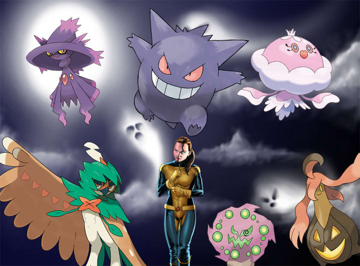 When Kitty's X-Gene activated she found she could phase through solid objects, which caused many to fear her for her ghostly powers. Seeking help, she went to Professor Xavier who tried to find a way to stop her ability. But while there a Misdreavus took a fondness to Kitty and she discovered her phasing ability was on the same wavelength as Ghost-Type Pokemon. This caused her to seek out the more Ghost-Types, with the Misdreavus she befriended, who evolved to become her powerful Mismagius ready to face young trainers in battle. She is also in a relationship with Colossus.