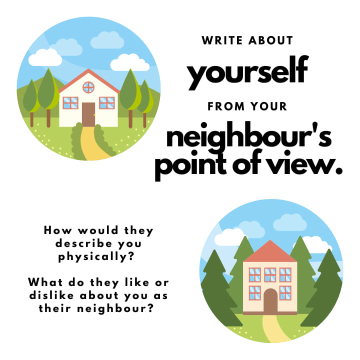Today, your challenge is to write a story from your neighbour’s point of view. Some of you might have many, some of you might have a single one. Pick one, and if needed, make one up. The goal of the exercise is not to portray your neighbour perfectly (so you’re not in trouble if you don’t know them that well), but rather to write about yourself from someone else’s point of view. How would they describe you physically? What do they like or dislike about you as their neighbour? Do you leave your trash cans out by the road for too long? Does your dog bark too often?