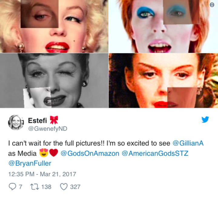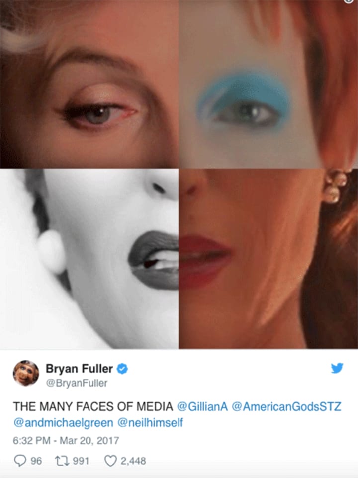 The showrunner posted a cryptic tweet alongside the caption, "The many faces of media." Either Anderson is auditioning for the next season of Undercover Boss, or American Gods is teasing us with something very special indeed. Fans of the upcoming #Starz show will know that Anderson will portray the new god Media in the eight-part series, while other cast members include The 100's Ricky Whittle, Deadwood's Ian McShane, and Back to the Future's Crispin Glover. Fuller is a co-creator of the show with TV, film, and comic writer Michael Green, and Gaiman himself will serve as an executive producer.