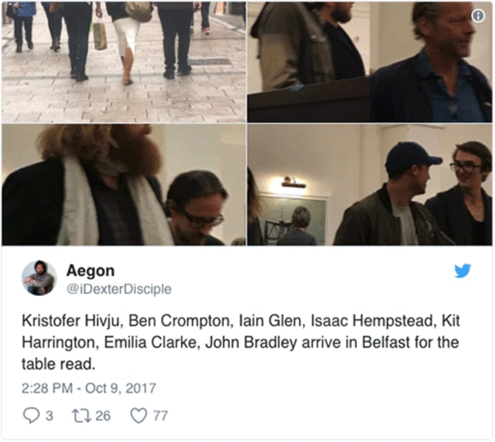 As the good and the great of #GameofThrones gathered for a Season 8 table read, there was a spoilerific tease of Tormund's fate simply by having actor Kristofer Hivju there. Thrones is pretty solid at not restricting its characters to lame flashbacks, so the appearance of Hivju in Belfast all but confirms he survived his icy brush with death in "The Dragon and the Wolf."