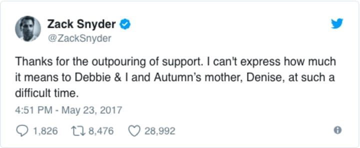 Here's the beautiful thing. Zack Snyder's work in the #DCEU has been pretty controversial, but this tragedy has seen fans unite in an unprecedented outpouring of sympathy and compassion.