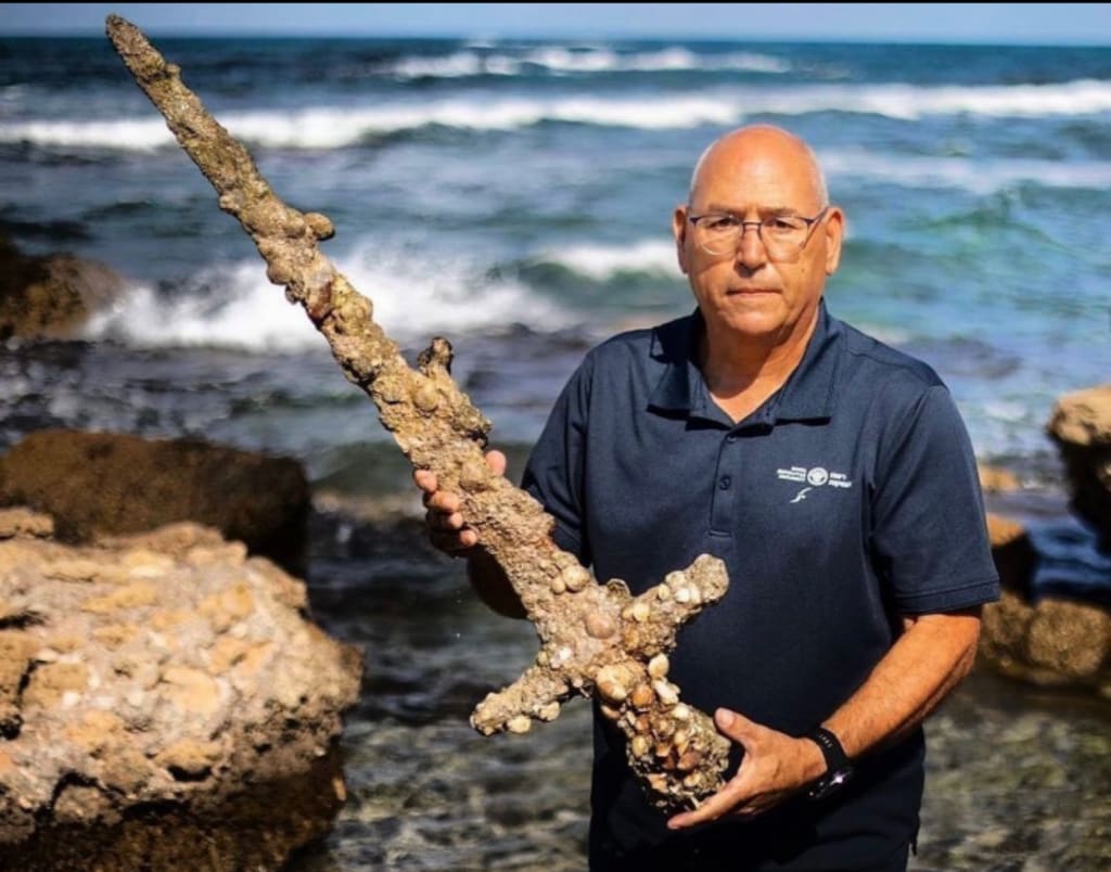 In October 2021 an extraordinary archaeological discovery was made off the northern coast of Israel a 900 year old Crusader sword lying on the seabed encrusted with marine life and remarkably well preserved after centuries underwater. This iron sword measuring just under four feet in length is believed to have belonged to a Crusader knight who was journeying to the Holy Land around 1100 AD during the early years of the Crusades. The find has captivated historians and the public alike offering a tangible link to a pivotal era in medieval history. The sword was found by Shlomi Katzin a recreational diver from the town of Atlit. While exploring a popular diving site near Haifa he came across ancient stone and metal anchors pottery fragments, and finally a sword covered in marine organisms. Understanding the significance of the object and the risk of it being buried again by sand or taken by looters Katzin retrieved the artifact and immediately contacted Israel's Antiquities Authority (IAA). Upon examination the IAA confirmed the sword to be approximately 900 years old. It was discovered in a natural anchorage used by ships since ancient times. The site had been monitored by the IAA due to its archaeological richness but the sword had only recently become visible due to shifting sands.