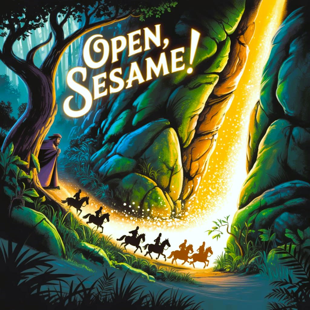 One day, while Ali Baba was gathering wood deep in the forest, he heard the sound of galloping horses. Startled, he quickly climbed a tree to hide. From his perch, he saw forty heavily armed men—a group of notorious thieves—stop in front of a giant rock. The leader of the group stood tall and shouted the magic words: