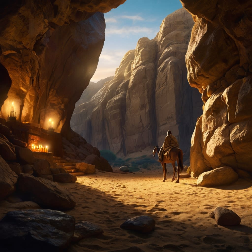 While working, Ali Baba saw a cloud of dust rising in the distance. Curious, he hid behind a tree and watched as forty horsemen — fierce-looking bandits — rode toward a large rock formation. They dismounted, and the leader stepped forward, raising his hands and shouting: