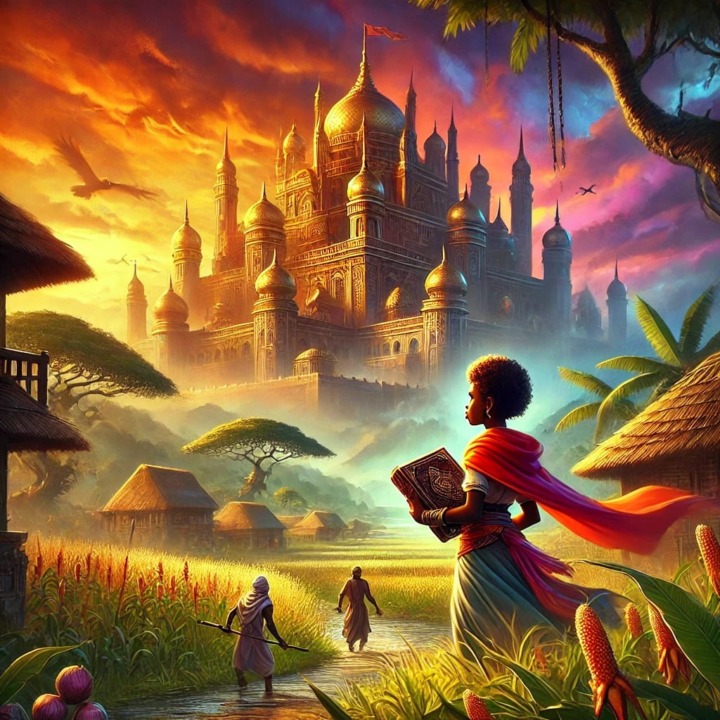 In the heart of a lush African kingdom, where the land stretched out in gentle undulations, a young girl named Amina lived a simple life. Her village was nestled in the embrace of nature's bounty, surrounded by fields of maize and yams that danced with the whisper of the zephyrs. The days were warm and golden, the nights cool and lulling, and the people were as warm as the sun that kissed the earth each dawn. The villagers knew happiness, for they were ruled by a king who had guided them with a gentle hand for many seasons. His wisdom was like the mighty baobab tree, steadfast and nurturing.