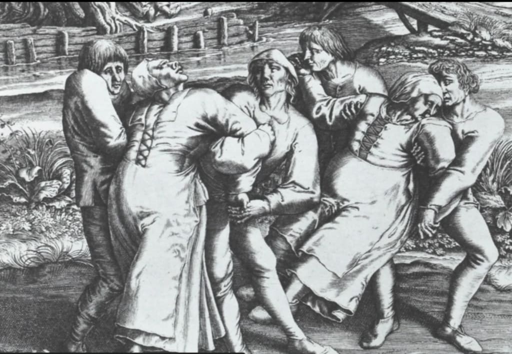Frau Troffea had never heard such a foolish notion. Why should she lie down on a day such as this? With a dazed smile on her flushed face, she grasped her daughters' hands, drawing them into the dance with her. A few of her neighbors stopped what they were doing not long after, drawn to the strange scene. Some approached with laughter on their lips, joining in on Frau Troffea's odd and spirited dance. When three hours passed and she continued to dance wildly up and down the street, however, their laughter was silenced by fear.