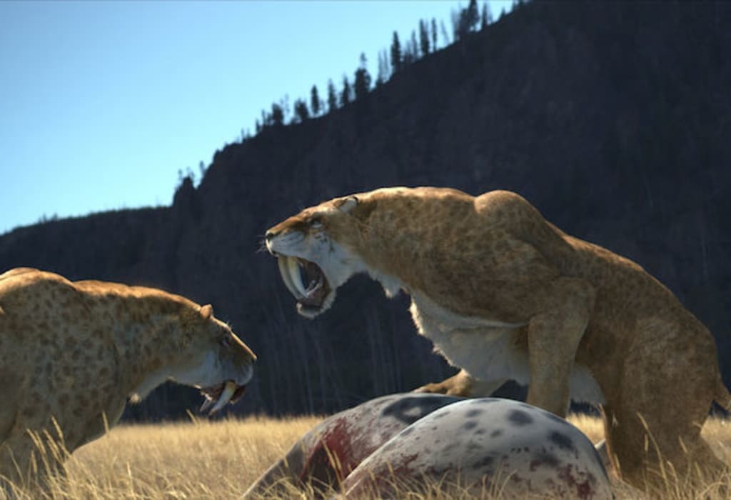 The Sabretooth cat, Smilodon, famous from the "Ice Age" movies, lived in the Americas 2.5 million years ago. Despite their fearsome eight-inch fangs, they had a relatively weak bite force of 220 pounds, slightly stronger than a human's. Their muscular build and long front legs helped them wrestle prey, pinning it down before making a precise bite to the throat. They went extinct 10,000 years ago due to climate change and human hunting. Cat lovers can be thankful these predators are gone.