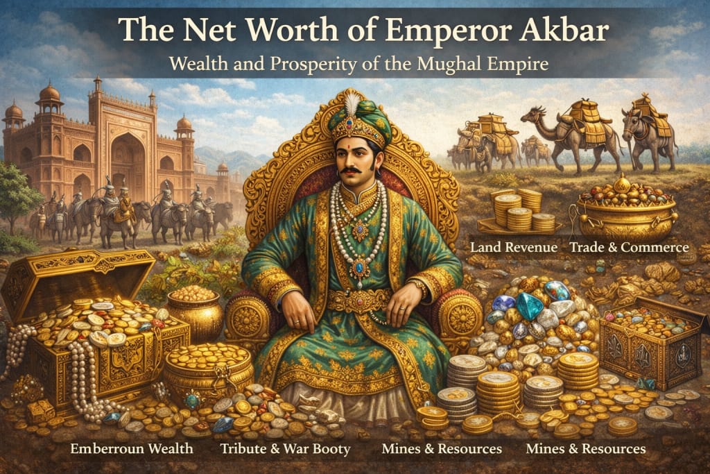 Emperor Akbar ruled one of the richest empires in world history. Through efficient land revenue systems, flourishing agriculture, global trade, and wise governance, he controlled immense wealth. His net worth was not only measured in gold and jewels, but in economic stability, cultural growth, and imperial power.