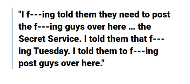 "I f---ing told them they need to post the f---ing guys over here … the Secret Service," the officer says. "I told them that f---ing Tuesday. I told them to f---ing post guys over here."