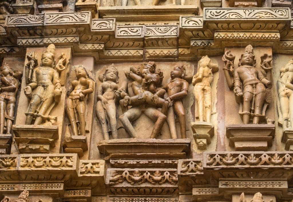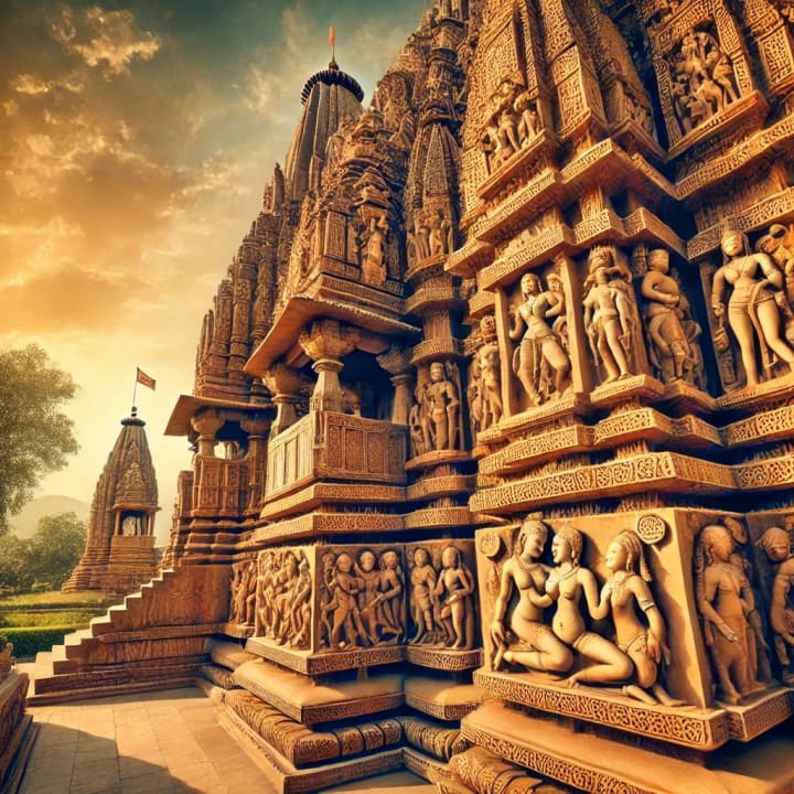 The Khajuraho Temple complex in India is a remarkable testament to the artistic and cultural achievements of ancient India. Recognized as a UNESCO World Heritage Site these temples are renowned for their intricate and exquisite sculptures particularly those depicting themes from the Kama Sutra. Located in the Chhatarpur district of Madhya Pradesh Khajuraho is a symbol of India's rich heritage and architectural brilliance. The temples built between 950 and 1050 CE during the Chandela dynasty were once part of a larger group of 85 temples of which only 25 survive today. These temples are divided into three groups Western Eastern and Southern and are dedicated to both Hindu and Jain traditions. The most striking feature of the Khajuraho temples is their elaborate and detailed sculptures which adorn the walls pillars and ceilings. Among these the sculptures inspired by the Kama Sutra are the most celebrated. The Kama Sutra an ancient Indian text attributed to Vatsyayana is a treatise on human relationships love and intimacy. While the text itself is often misunderstood as merely a manual on sexual positions it is, in fact, a comprehensive guide to the art of living encompassing ethics relationships and the pursuit of pleasure as one of the four goals of human life Purusharthas. The sculptures at Khajuraho beautifully capture the essence of this philosophy depicting various aspects of human life, including love romance and intimacy, in a highly artistic and sophisticated manner.