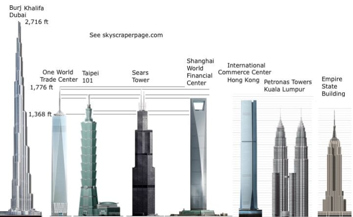 Work started on the twin towers in the Summer of 1966. There are a surprising amount of photos. There is an absolutely amazing site that is cataloging a bunch of photos from history check them out HERE. They are a non-profit with a passion of preserving the past so please go take a look at there amazing article. The buildings rose quickly taking only 5 years to be completely done. The North Tower became the tallest building in the world standing at a height of 1,254 feet (382.2 meters). Rising 110 story's into the New York sky.An impressive feat for the time. There are much taller buildings in the world today. The tallest being the Burj Khalifa in Dubai, United Arab Emirates soaring high at a height of 2,722 feet (829.8 meters).
