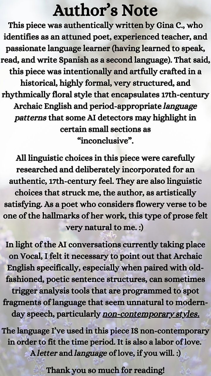 I had a dream about us, my darling. We were in our old, secret place—the hidden lavender field behind the Bridge at North River. Dost thou remember it? We were there, as in our youth, tumbling around like lust-ridden rabbits—our skin swaddled in mere morning mist and desire. Oh, what fools we were to defy the Church. What unbridled teens!
