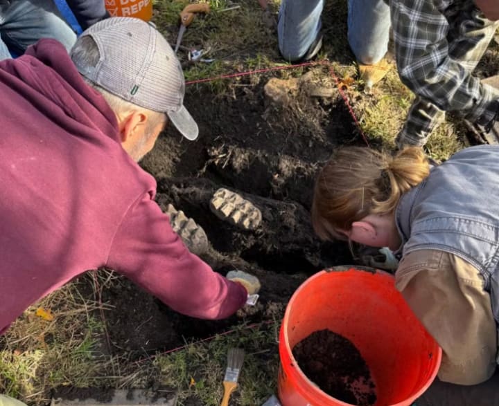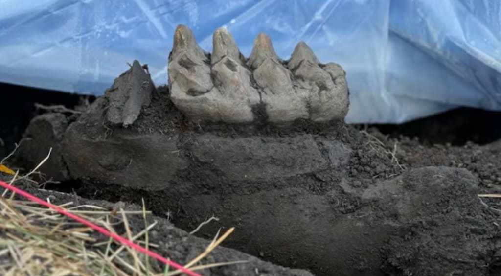 A subsequent trip to the excavation site — a.k.a. the couple's Orange County property — revealed two more mastodon teeth embedded in a complete jaw, as well as a toe and a partial rib.