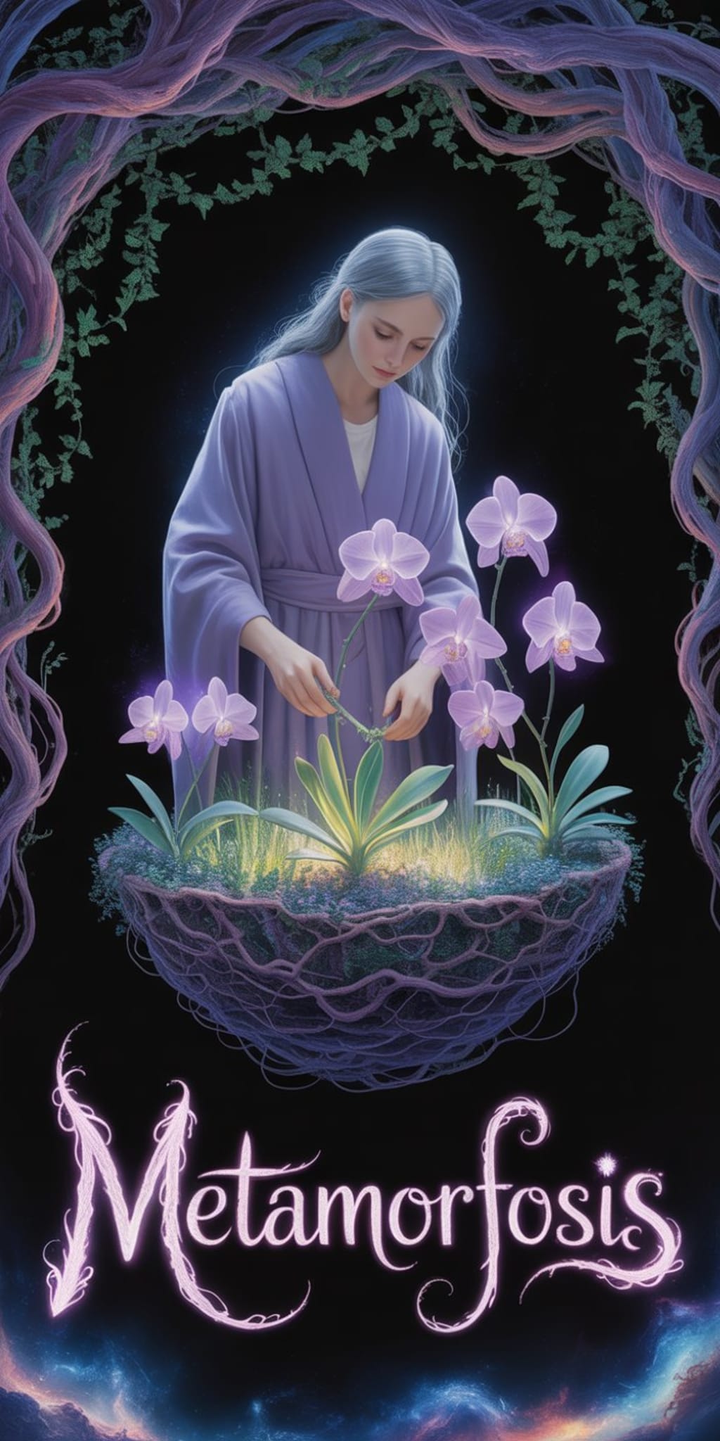 Now, in this rebirth-space suspended beyond known stars, she was given a task: to care for the Orchids of Becoming. They bloomed from the soil of memory, fed by what was let go. Each violet blossom opened with a sigh, releasing tiny particles of light that danced upward into the canopy, becoming stars in the night above.