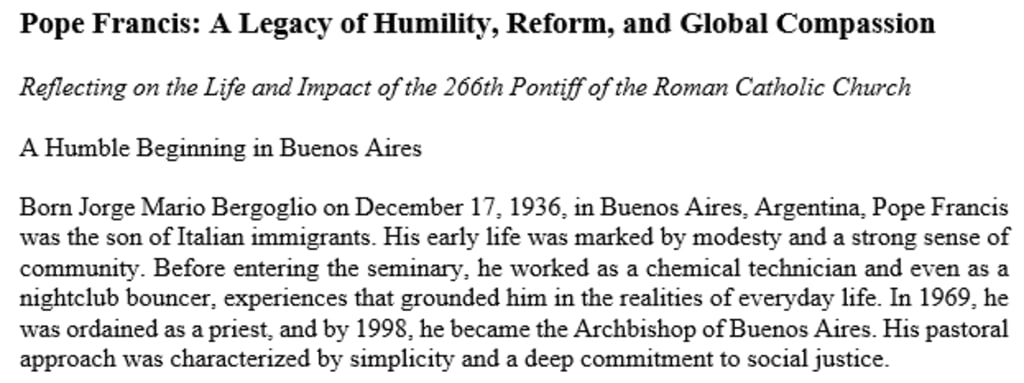 Pope Francis's legacy is one of humility, compassion, and a relentless pursuit of justice. He redefined the papacy by emphasizing service over authority and inclusivity over exclusion. His teachings and actions have left an indelible mark on the Catholic Church and the world, inspiring countless individuals to live with empathy and purpose.