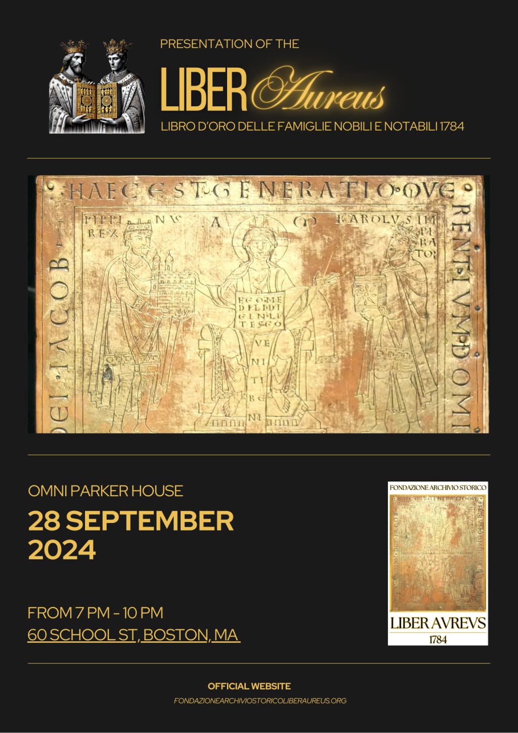 On Saturday, September 28, at 7:00 PM, the historic Omni Parker House in Boston will host the highly anticipated presentation of the Fondazione Archivio Storico Liber Aureus and its groundbreaking project, the LIBER AUREUS – Libro d’Oro delle Famiglie Nobili e Notabili 1784. This “book”/digital archive is set to revolutionize the way Italian noble genealogies are preserved, enabling families to maintain and update their historical records in a secure, globally accessible digital format.