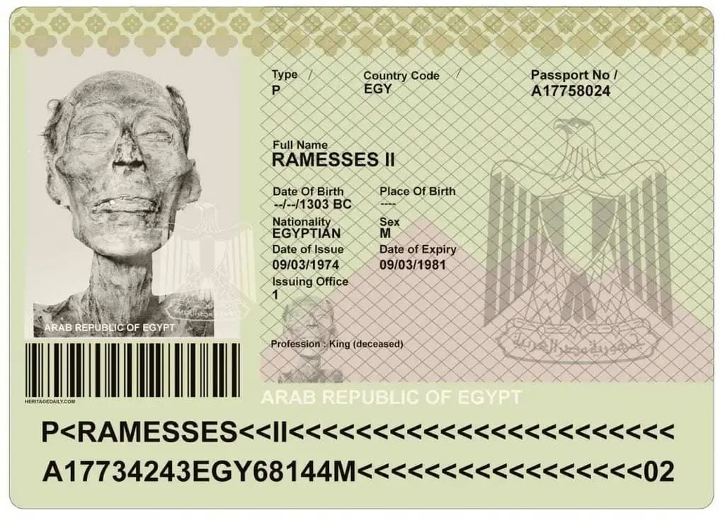 In 1976, his remains were issued an Egyptian passport (nearly 3 thousand years after his death) so that he could be transported to Paris for an irradiated treatment to prevent a fungoid growth.