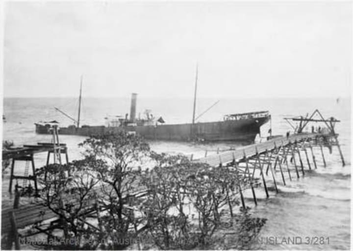 The first recorded shipwreck. She had loaded 2270 tons of phosphate and was steaming towards the loading berth to finish off when she had the misfortune to run on the reef. She sank the same evening at Sydney Point (also known as Solomon Point).
