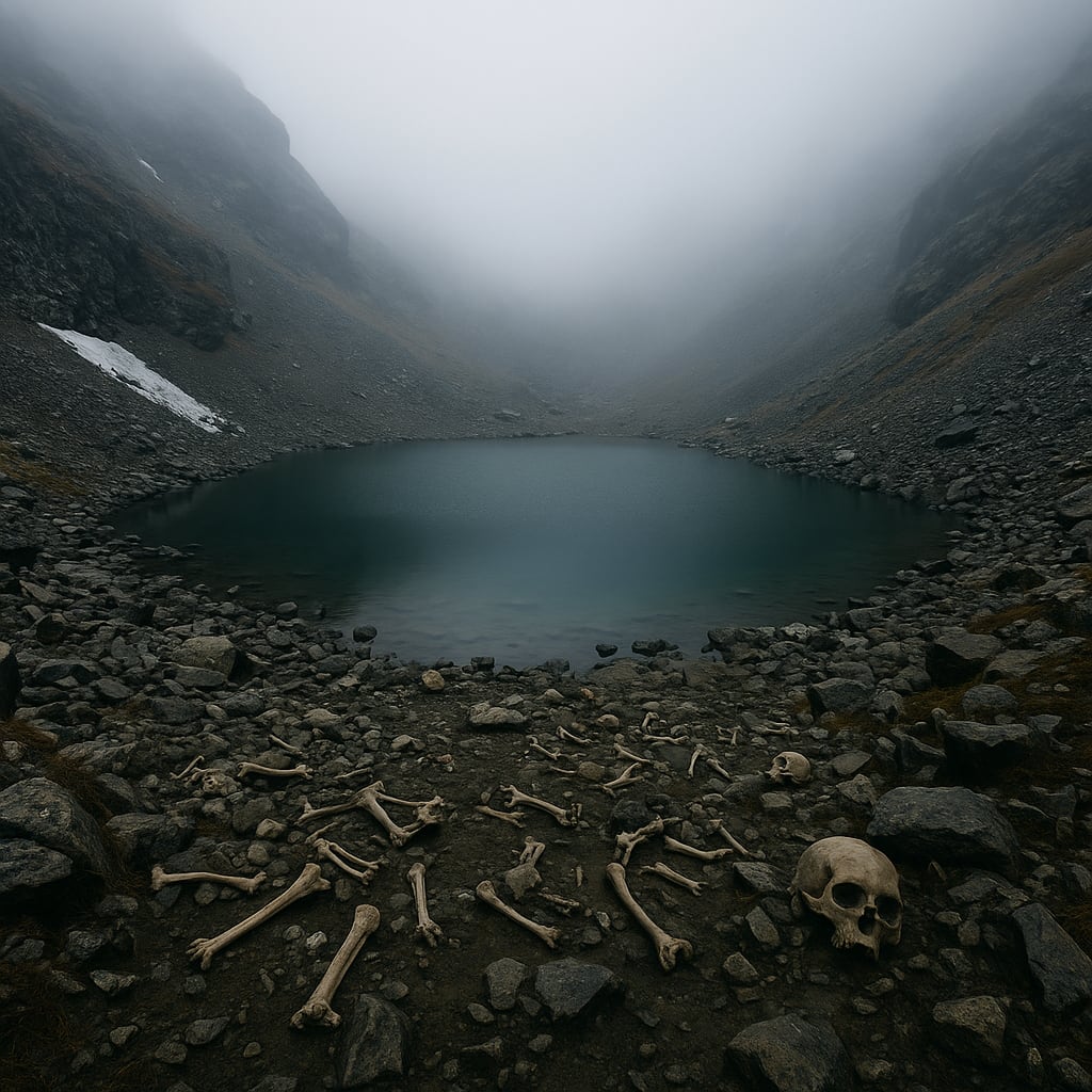Imagine trekking through blinding snow, lungs burning from the altitude, when you come across it; a glassy pool framed by craggy peaks, reflecting a sky so blue it looks almost unnatural. You approach... The ice thins... Beneath the surface? Bones... Femurs, ribs, skulls, staring up like pale antiques through a curio cabinet of cold water. And when the ice finally breaks? Hundreds of skeletons litter the rocky shore, tangled like marionettes tossed aside by a careless god.