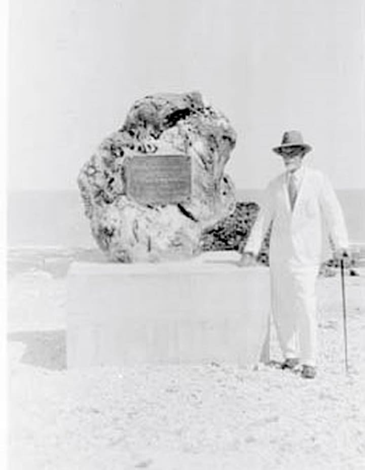 Seeing the photo of the pinnacle and tablet marking the first arrival of Albert Ellis sent me to my old Ocean Island photo album. The day the memorial was unveiled my husband had erected a wooden frame which stood in front of the pinnacle and devised a contraption whereby the masking flag would fall gracefully when Sir Albert pulled the tassel.