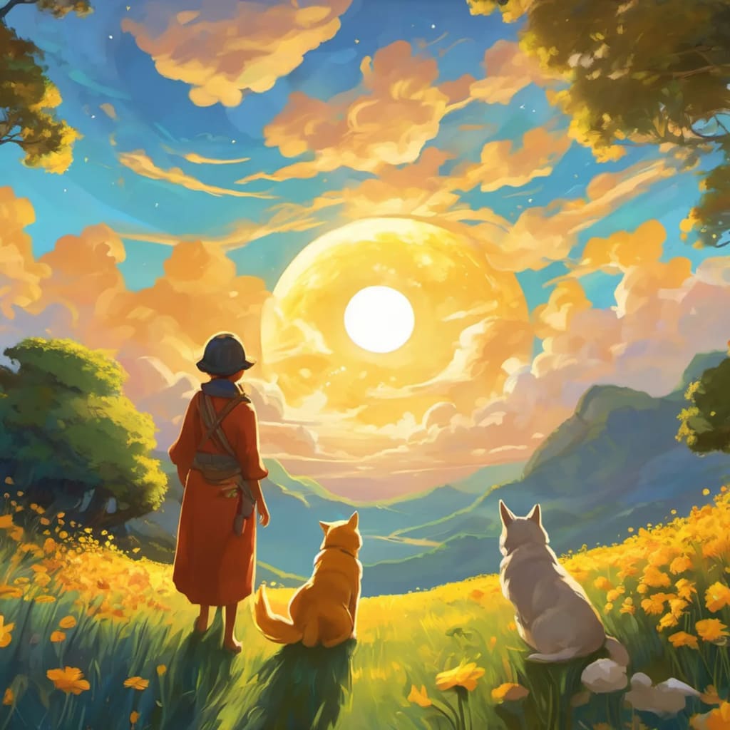 Once upon a time, in a land far away, there were two celestial beings who were the best of friends - the Sun and the Moon. Every day, they would chase each other across the sky, taking turns to shine their light on the Earth. The Sun, bright and golden, loved waking up early in the morning. It would peek over the horizon, spreading its warm rays, and watch as the world came alive. The Sun loved greeting all the creatures of the land with its cheerful rays, giving them energy and helping plants grow. It would play hide-and-seek with the clouds, and even whisper gentle hellos to the sleepy flowers as they bloomed.