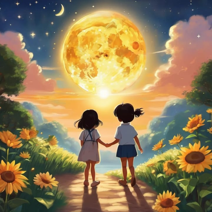 children were in awe, and the Sun and the Moon were delighted to see the happiness they brought to the world. And so, dear little one, the Sun and the Moon showed us that friendship has no boundaries, not even between the sky and the earth. They taught us that even though they only cross paths for a brief moment each day, their bond is unbreakable. So, the next time you look up at the sky, remember that the Sun and the Moon are looking out for you, just as they are for each other. And they remind us all that true friendship shines brightly, no matter the time of day. The end.