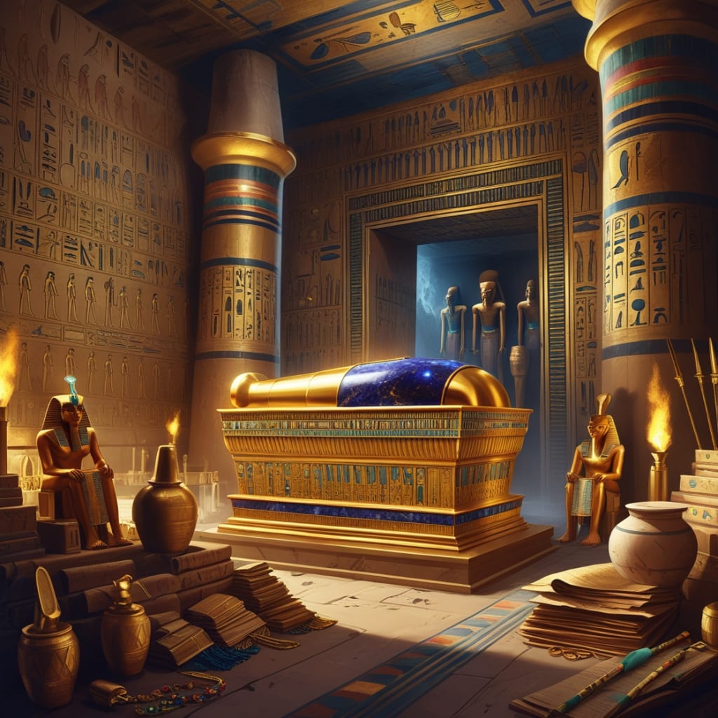 A Golden Sarcophagus: Presumably larger and more intricately designed than Tutankhamun’s, embellished with scenes of the afterlife and inlaid with precious gemstones.