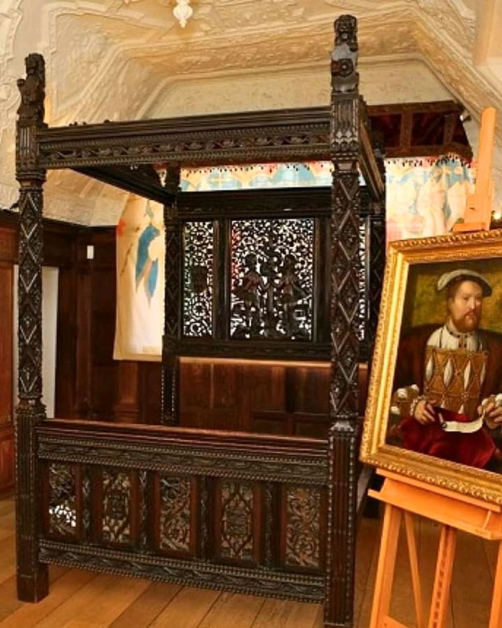 The bed is a stunning example of medieval artistry and woodworking. Carved from oak, its intricate detailing showcases the skills of 15th-century craftsmen. The headboard features scenes from the Garden of Eden, symbolizing fertility and the sanctity of marriage. Other carvings include royal coats of arms and Tudor roses, reinforcing its connection to Henry VII and Elizabeth of York.