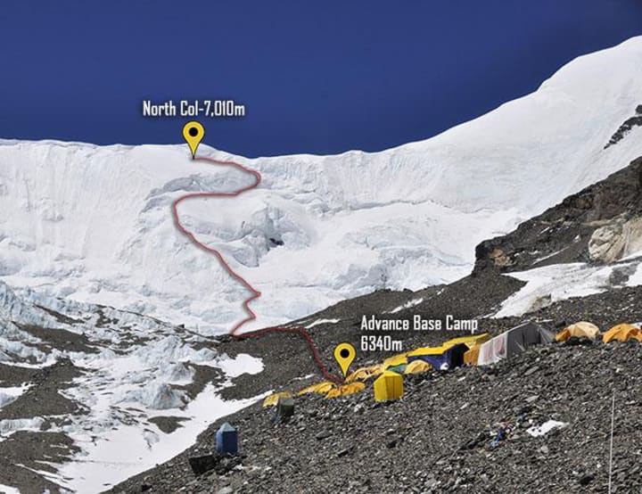 The North Col refers to the sharp-edged pass carved by glaciers in the ridge connecting Mount Everest and Changtse in Tibet. It is located more than 20,000 feet above sea level, less than 9000 feet from the peak of the mountain.