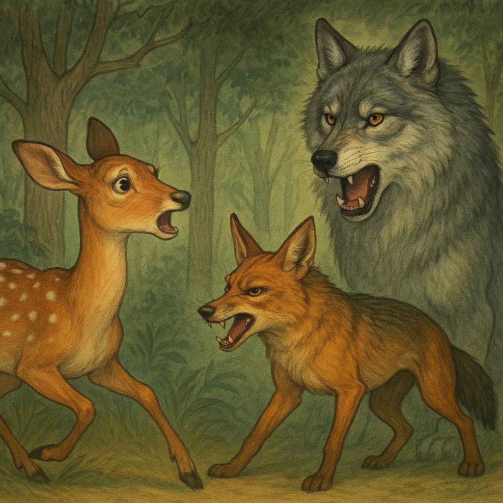 Just then, out of the shadows appeared a jackal. Lean and sly, with sharp eyes that gleamed like polished stone, he approached the deer with a sly grin.