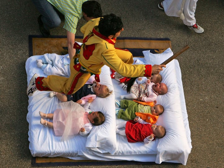 In the small town of Castrillo de Murcia, Spain, an unusual ritual known as El Colacho has been practiced since the 17th century. During this annual event, men dressed as devils leap over rows of newborn babies lying on mattresses in the street.