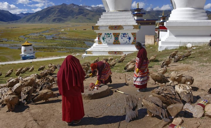In some remote regions of Tibet and Mongolia, a spiritual funeral practice known as Sky Burial is still performed. Instead of burying or cremating the dead, bodies are placed on mountaintops to be consumed by vultures.
