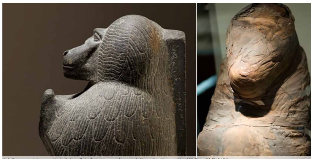 A variety of deities were depicted as animals in ancient Egypt. Thoth, the deity of knowledge and insight, was symbolized by a Hamadryas baboon. After they died, baboons that were most likely kept in captivity in Egypt were mummified and offered as votive offerings. There are no wild baboons living in Egypt now, and there is no proof that they ever were. Thus, the mystery of where they originated remains.