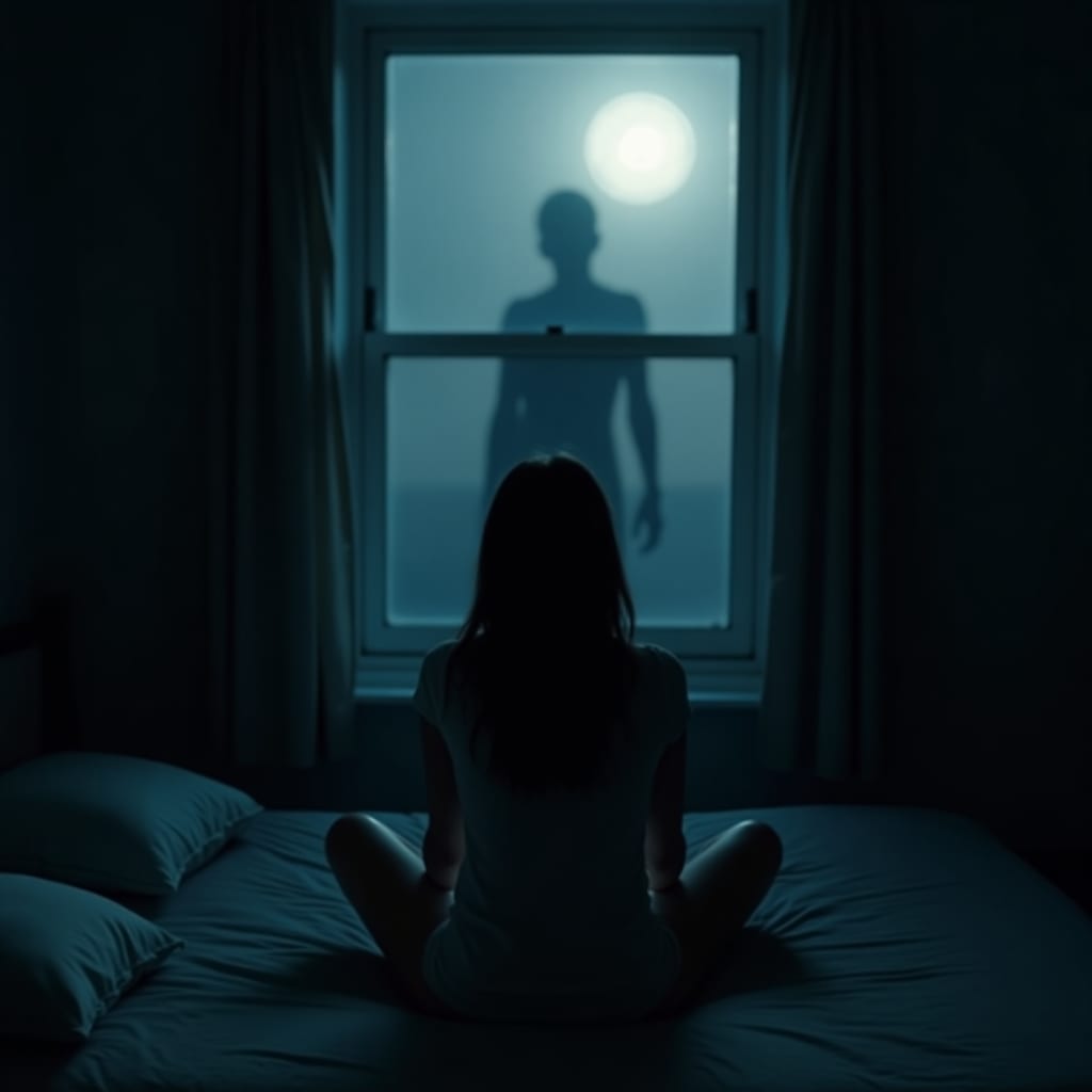 Her breath stopped. She turned slowly toward the window — and saw the reflection of a man in the glass. Tall. Hooded. Standing in the shadows of her room.