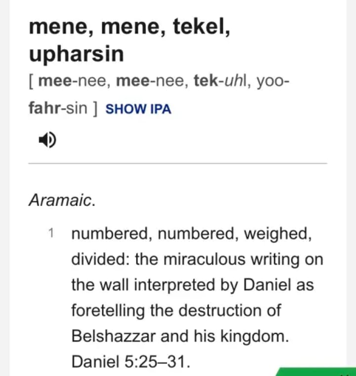 Daniel goes on to confirm that the finger writing on the wall had indeed come from God Himself, and then gave the interpretation. The inscription said "Mene, men tekel upharisan."