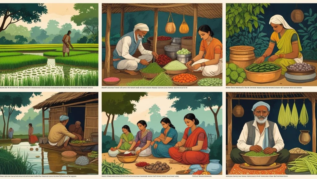Spring arrived with a warm breeze, waking the fields. My father, Baba, shaped pots by the riverbank, his hands slick with clay, while Ma tended our small rice paddy. Food was simple but deliberate. Breakfast was bhaat—rice boiled soft in an earthen pot, paired with shak we foraged from the forest’s edge. The greens—bitter kalmi or tender water spinach—were free for those who knew where to look. My sister, Lila, and I would wander before dawn, baskets swinging, hunting for kathal seeds or wild amra fruit. The forest was generous but tricky; one wrong root could sicken you. Ma taught us the old ways—her mother’s knowledge of which leaves soothed and which poisoned.