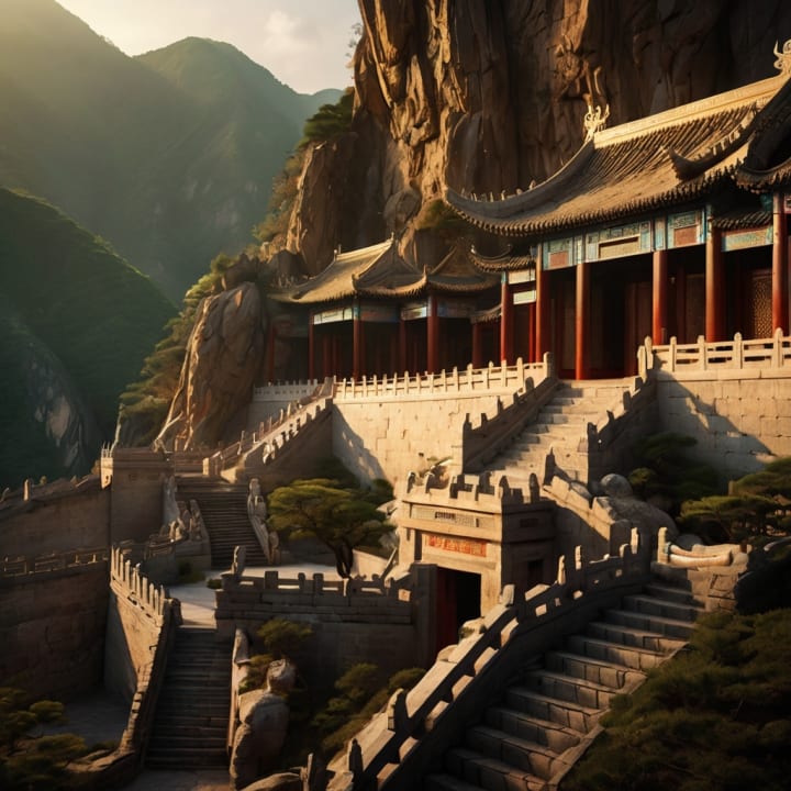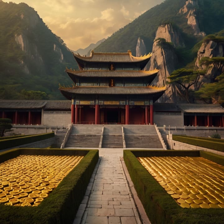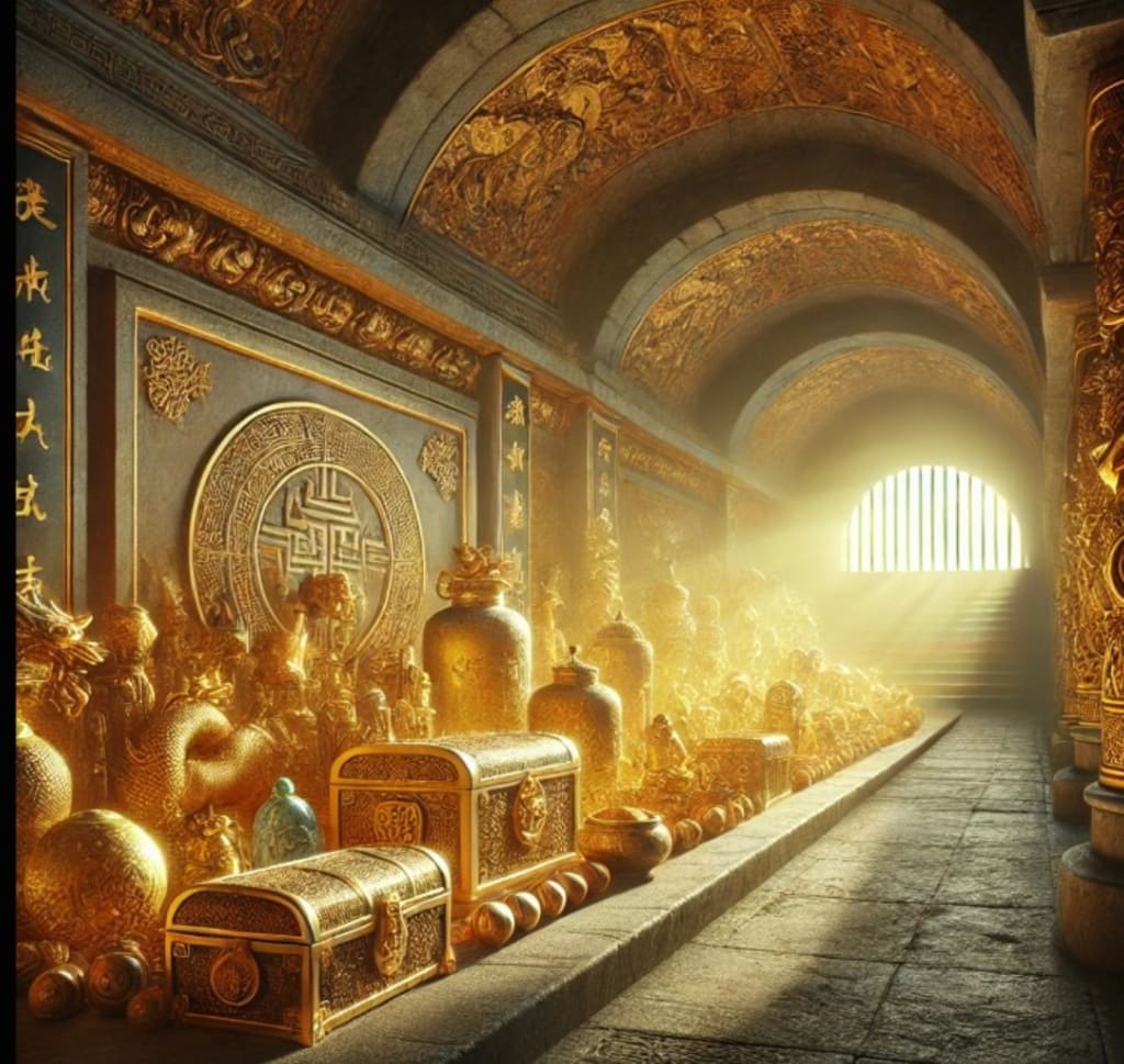 Deep within the heart of an ancient Chinese mountain, a hidden chamber revealed its secrets—golden artifacts, exquisite jade carvings, and scrolls of forgotten wisdom. The treasures, glowing under a warm light, spoke of an era of imperial grandeur and cultural sophistication. Intricate dragon motifs and symbols of power etched into the stone walls guarded the legacy of China's glorious past, inspiring awe and reverence in all who discovered it.