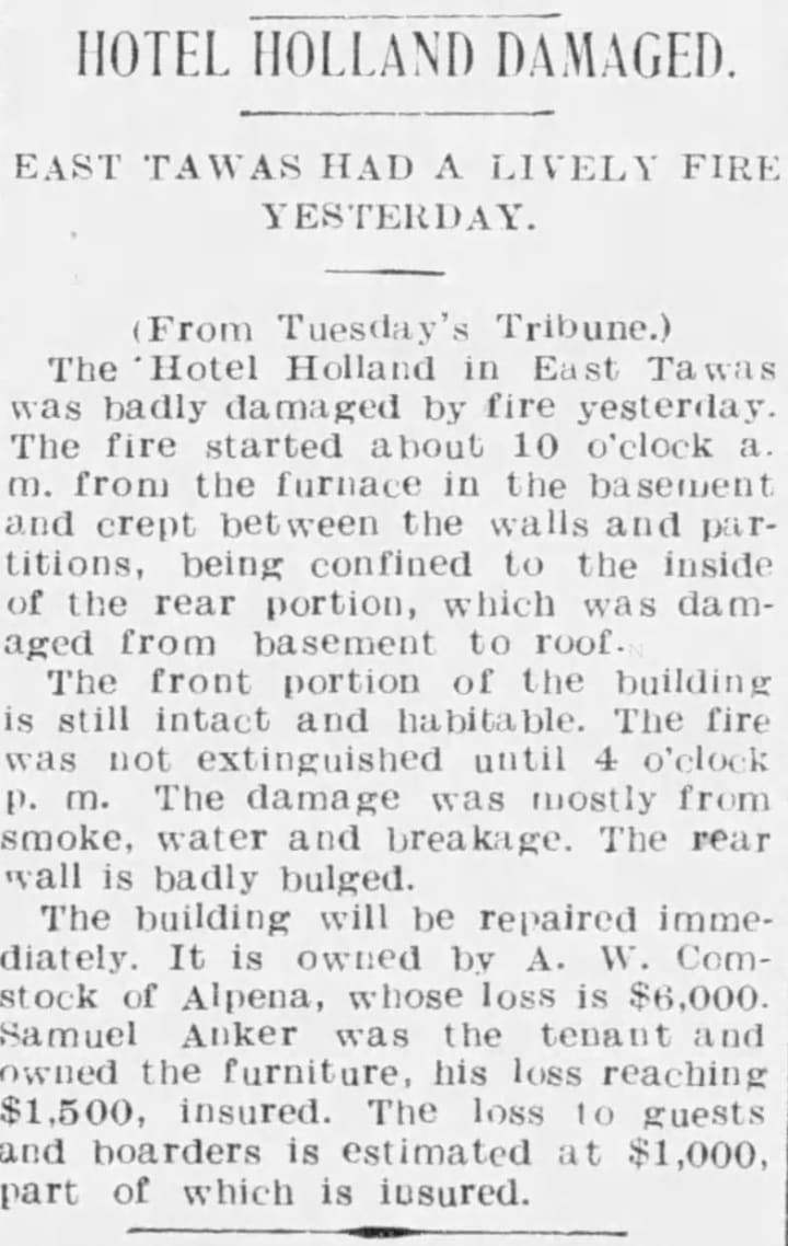 - Tawas Herald, report on destruction of Holland Hotel by fire, estimated loss.