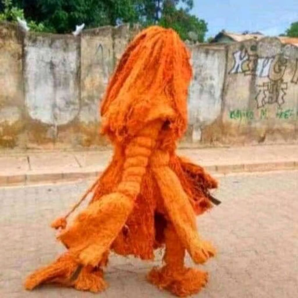 The Kankurang is a mythical character covered with red bark of a tree called "fara". He is considered by the Mandinka community as a protective genius for the circumcised during their initiation.