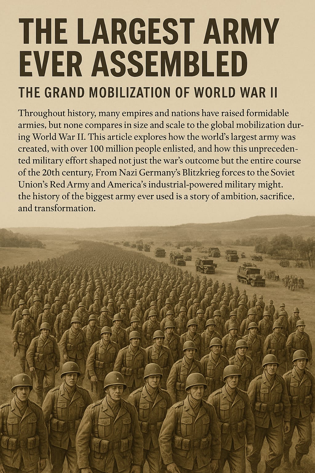World War II witnessed the greatest military mobilization in human history, with over 100 million people enlisted across various nations. From the Soviet Red Army’s staggering numbers to the United States' industrial war machine, and from Nazi Germany’s Blitzkrieg forces to China’s prolonged resistance against Japan, this massive convergence of manpower reshaped global warfare and geopolitics. This article explores the scale, strategy, and legacy of the largest army ever assembled.