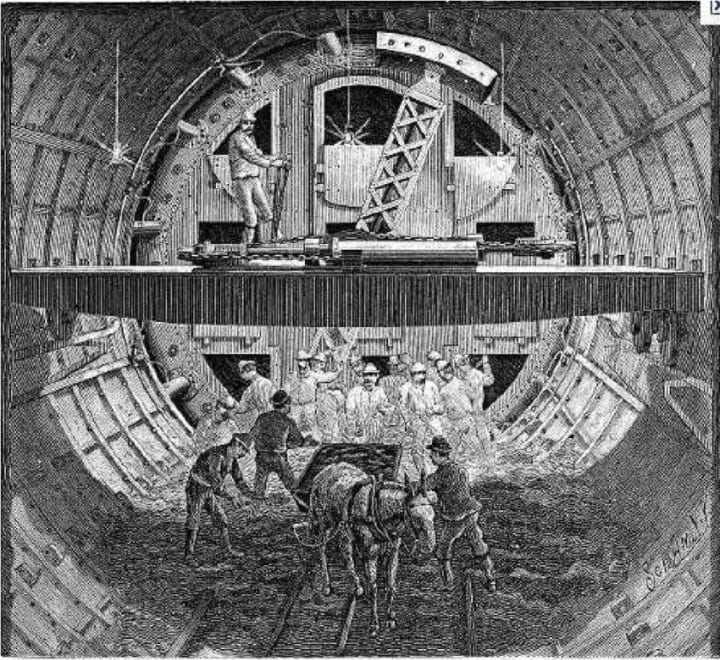 As the Underground expanded, new technology allowed for deeper tunneling, avoiding the disruption of cut-and-cover methods. The invention of the Greathead Shield, developed by engineer James Henry Greathead, revolutionized underground construction. This shield allowed workers to excavate deep below the surface, protecting them from cave-ins as they tunneled beneath the city. Workers could manually dig through the earth, and the shield would be pushed forward, creating space for the tunnel. Cast-iron segments were then installed to form the tunnel walls.
