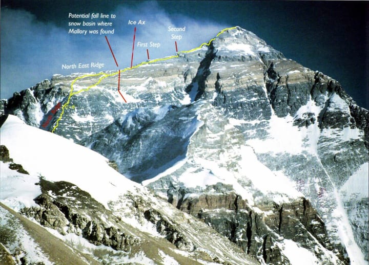 The researchers also believed it was Mallory who slipped first because he was found about 300 meters below an ice axe that belonged to Irvine, this axe which was initially found in a location 100 meters horizontally from Mallory's body was found in 1933. So it's either Irvine fell with Mallory or that he died from other causes such as hypothermia or even starvation.